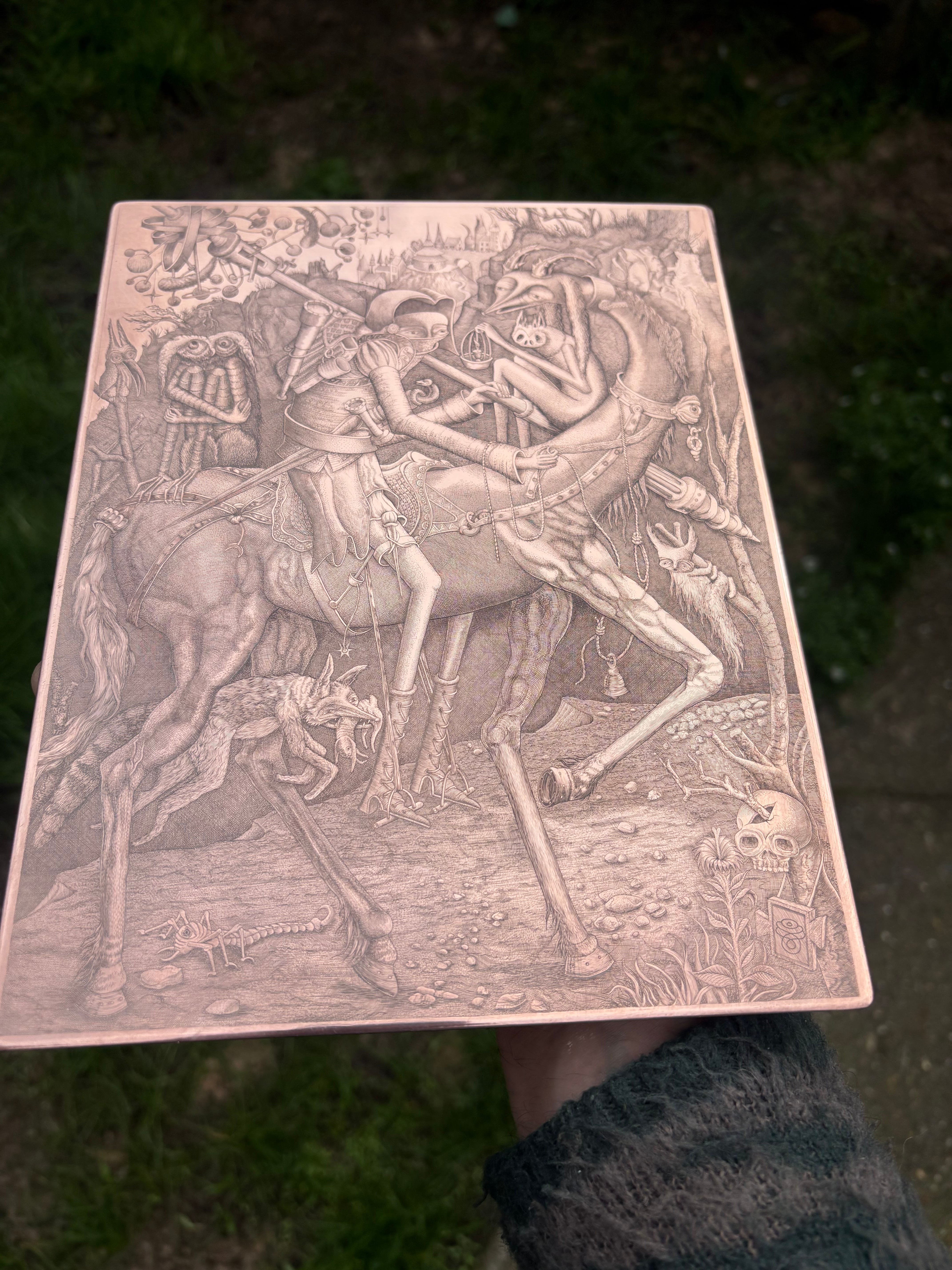 Im sat at my desk after putting away my durer copies of knight death and the devil for the first time in over three years. In early june 2023 i started work on my own engraved interpretation of his most famous engraving. Even before that i’d spent over a year studying hundreds of impressions and doing engraving experiments. Testing the waters to see if it was at all possible to tread in Durers footsteps without making fool out of myself for trying.